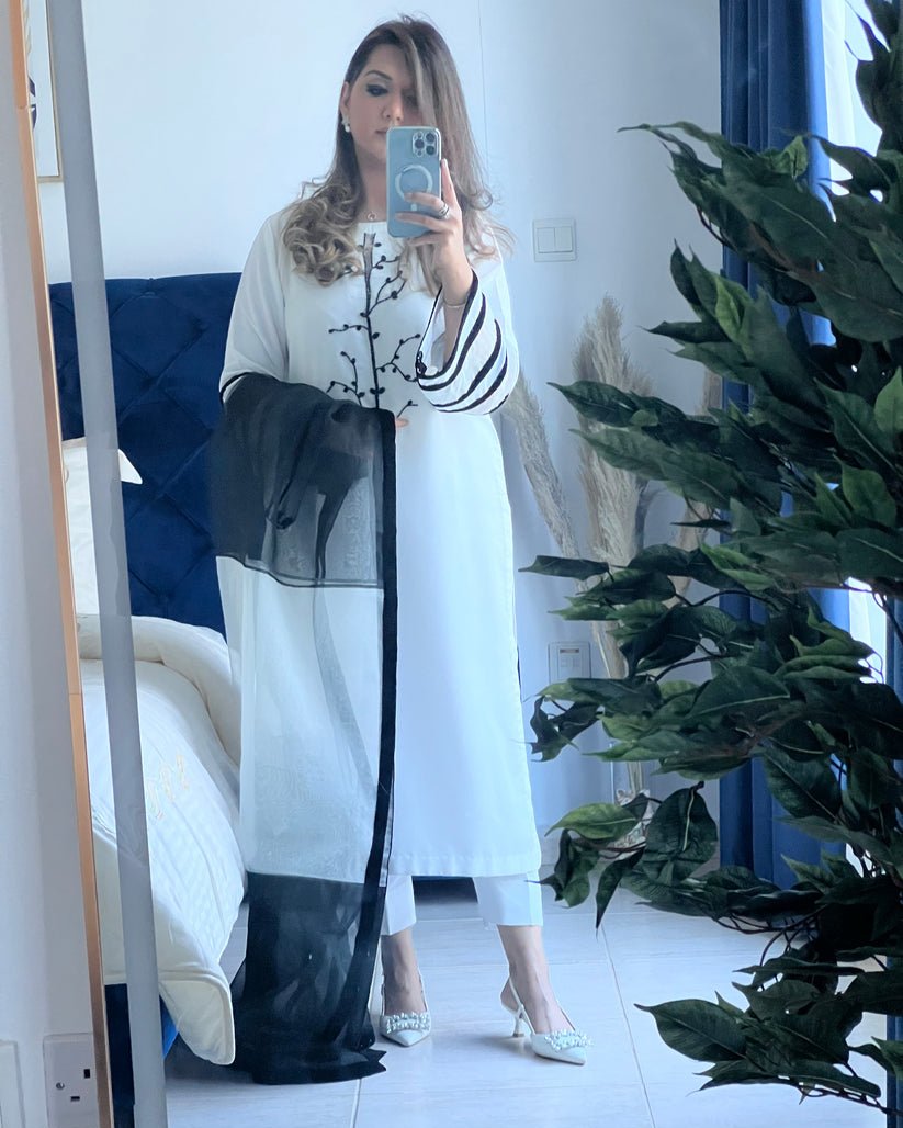 A two-tone black and white ombre dupatta with velvet borders, along with white silk straight pant complete the ensemble.