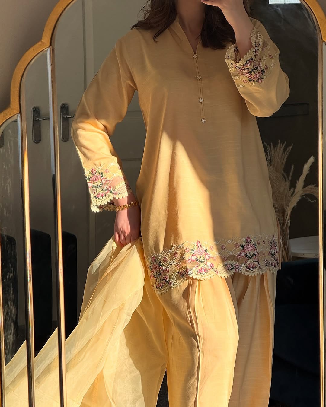 3Pc Embroidered Raw Silk with Farshi Shalwar with Organza Embroidered Border