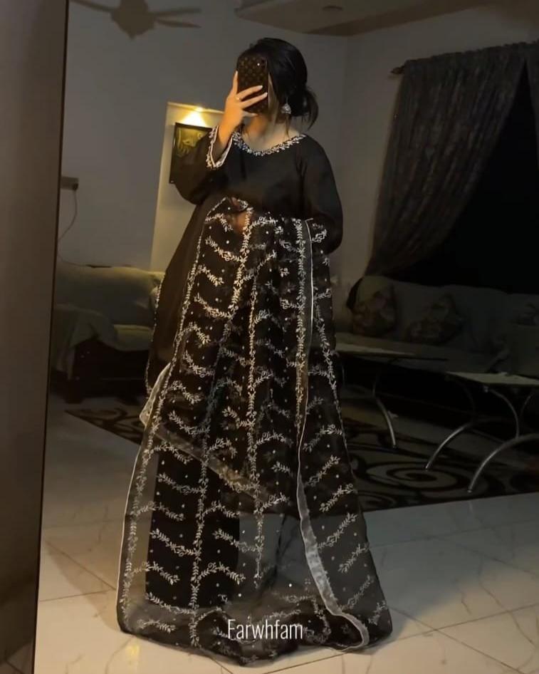 Description: Indulge in the magic of ‘Pretty in Pink’ where a celestial dreamscape unfolds in soft shade of pink. Frosty Pink is a three piece stitched ensemble. A soft pink silk shirt with a delicate silver tilla sequinned embroidery and beads with pearls on the neckline, sleeves and border. It is paired with a wide legged silk pant. It comes with a heavily tilla embroidery and is sequinned all over on an organza dupatta adorned with tilla embroidery borders on all four sides.